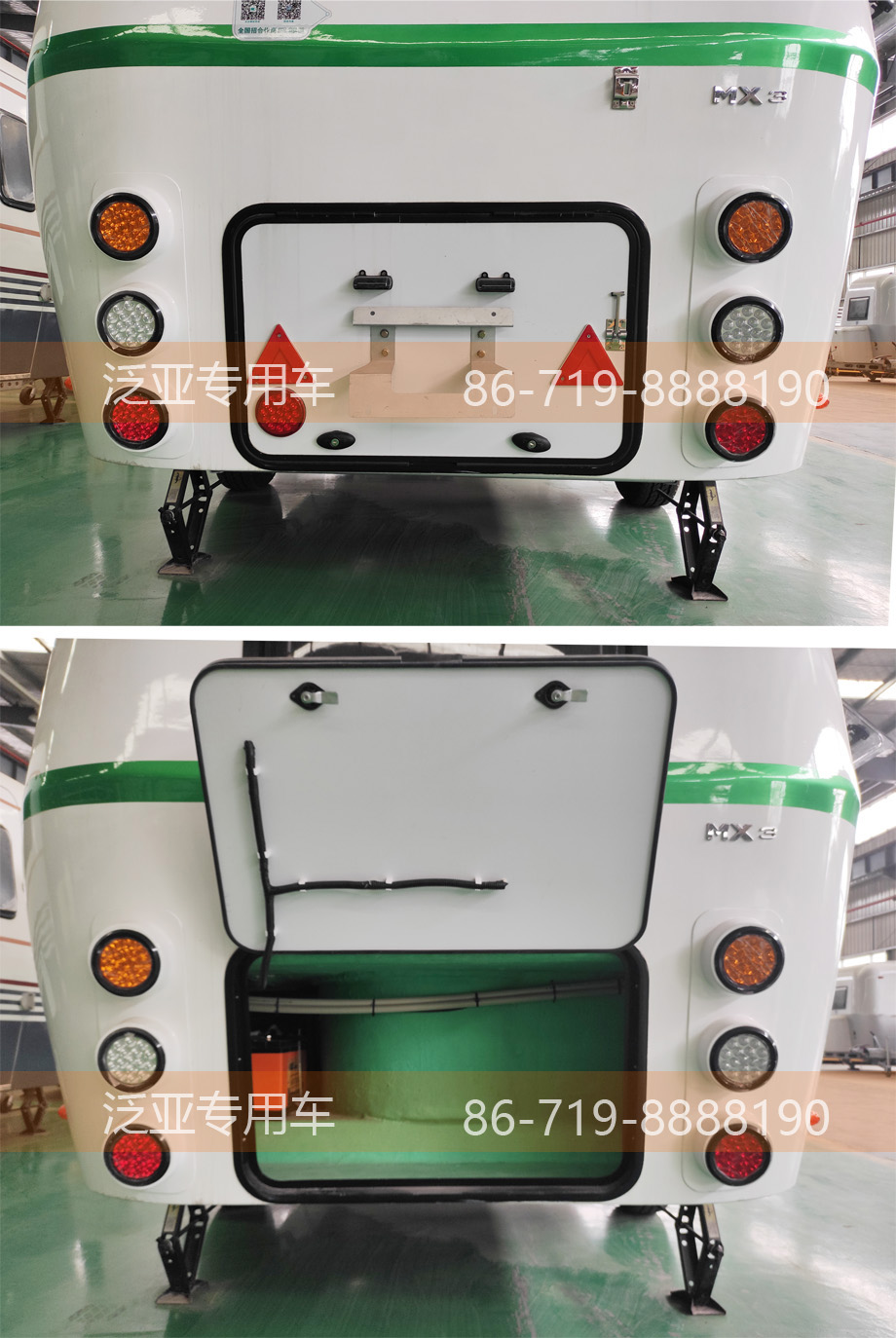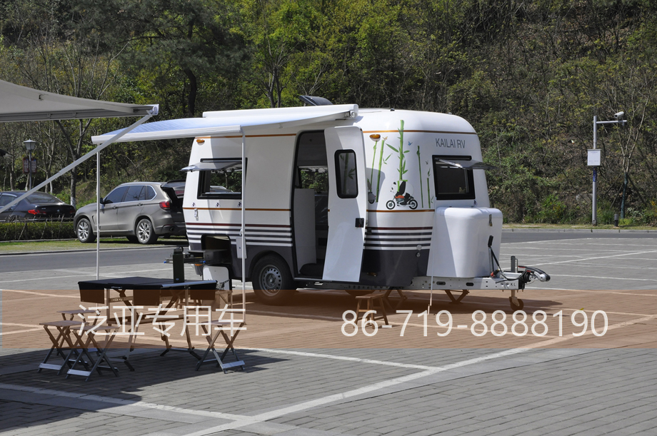 车辆后方功能齐全,转向,行车,刹车3对灯直接连通前方,行驶过程中毫无顾忌,凸起式的设计有效的减少行驶过程中灰尘的吸附,也让后面的车更加警觉,增强行车过程中的安全性。车尾的大舱门空间刚好可以容纳一台空调外机,对于选装空调的客户可谓量身定做。舱门上装有牌照架和牌照灯,不会存在看不清车牌号的情况,雾灯和放光标为安全又增加一层保障。车身左后方是我们的加水口,车内所使用的干净水全部是从这里加入,最多可以储存120L的清水。旁边的百叶窗是用来散热的,里面装的是2个12V100Ah的电瓶和1个3000W的大功率逆变器。回到车的侧面,车门是我们房车的特色之一,与车身结构统一,跟飞机舱门一样一体成型的专用车门,车门上装有一个固定窗,整体干净美观。车门上方是一个遮阳棚,,展开后最长2米,足可遮风挡雨。车顶可以选装365W的太阳能板,在日照充足的情况下每天大概能充2度,在不使用220V电的情况下还是比较受用的。