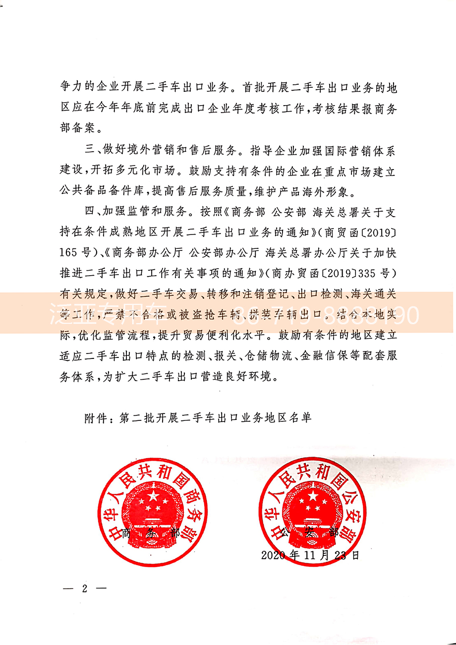 经济日报12月1日报道: 中国商务部、公安部近日联合印发通知,进一步扩大开展二手车出口业务的地区范围。