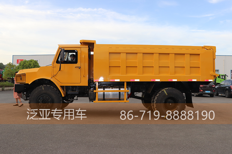 专业的矿区专用车。货箱尺寸L4200W2550H1100。边板10mm厚、底板14mm厚;自卸双顶ф130L1530。侧板整体田字格,后门整体单开。宽尾四底座。