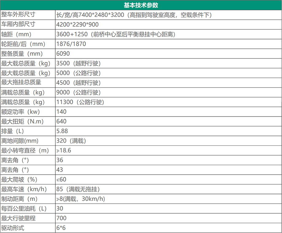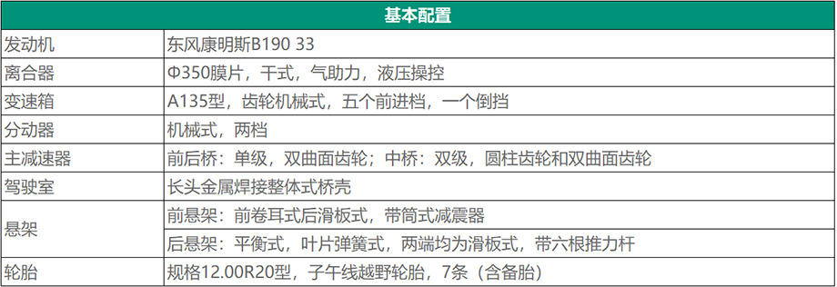 带有冷启动、防空灯、副油箱、机油桶、水桶、工具箱等军用附加装置,整车在-40℃环境温度下能顺利启动。