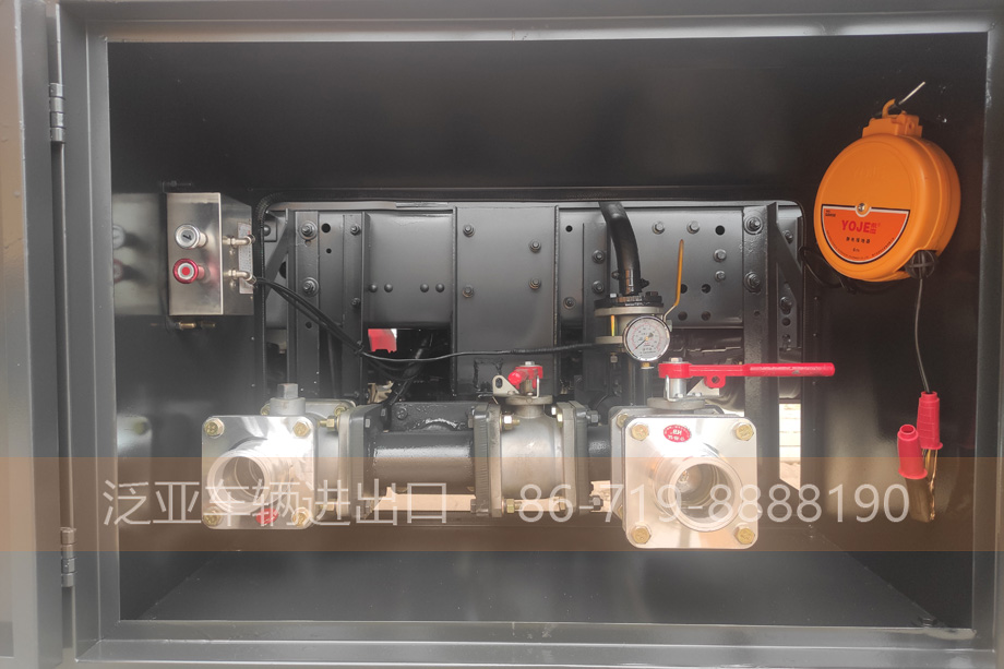 罐体采用碳钢材质,内有1道4mm厚阻浪板。罐体底部1只铝合金DN100气动紧急切断阀,配气控组合开关、紧急切断开关、未关闭语音提醒装置。后方带有爬梯,罐顶1只铝合金欧标人孔盖,左右两侧带铝合金折叠防护栏。罐体前部带加油操作仓,舱内装有加油机、加油管、加油枪及防爆照明灯