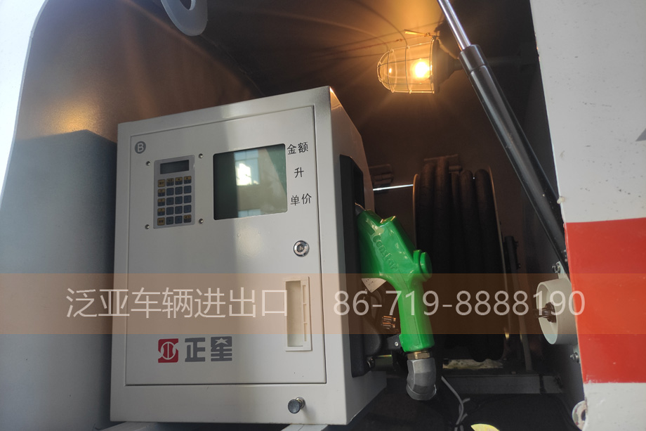 罐体采用碳钢材质,内有1道4mm厚阻浪板。罐体底部1只铝合金DN100气动紧急切断阀,配气控组合开关、紧急切断开关、未关闭语音提醒装置。后方带有爬梯,罐顶1只铝合金欧标人孔盖,左右两侧带铝合金折叠防护栏。罐体前部带加油操作仓,舱内装有加油机、加油管、加油枪及防爆照明灯