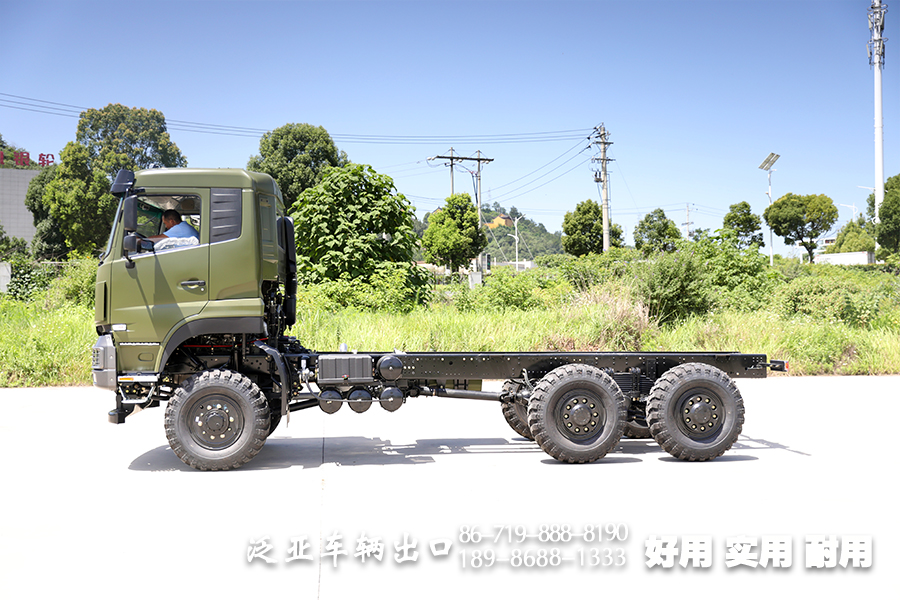 6x6东风重型专用车底盘,总质量可达25吨,六轮驱动使得它可以在山路、森林等地区行驶,适合改装成载货卡车、自卸汽车、混凝土搅拌车等专用重型车。