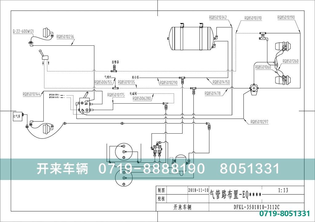 该气路包含了3个贮气筒,包含了快放阀、继动阀、差动阀和手控阀、干燥器等阀类,有效的保证了气路的高效、可靠!