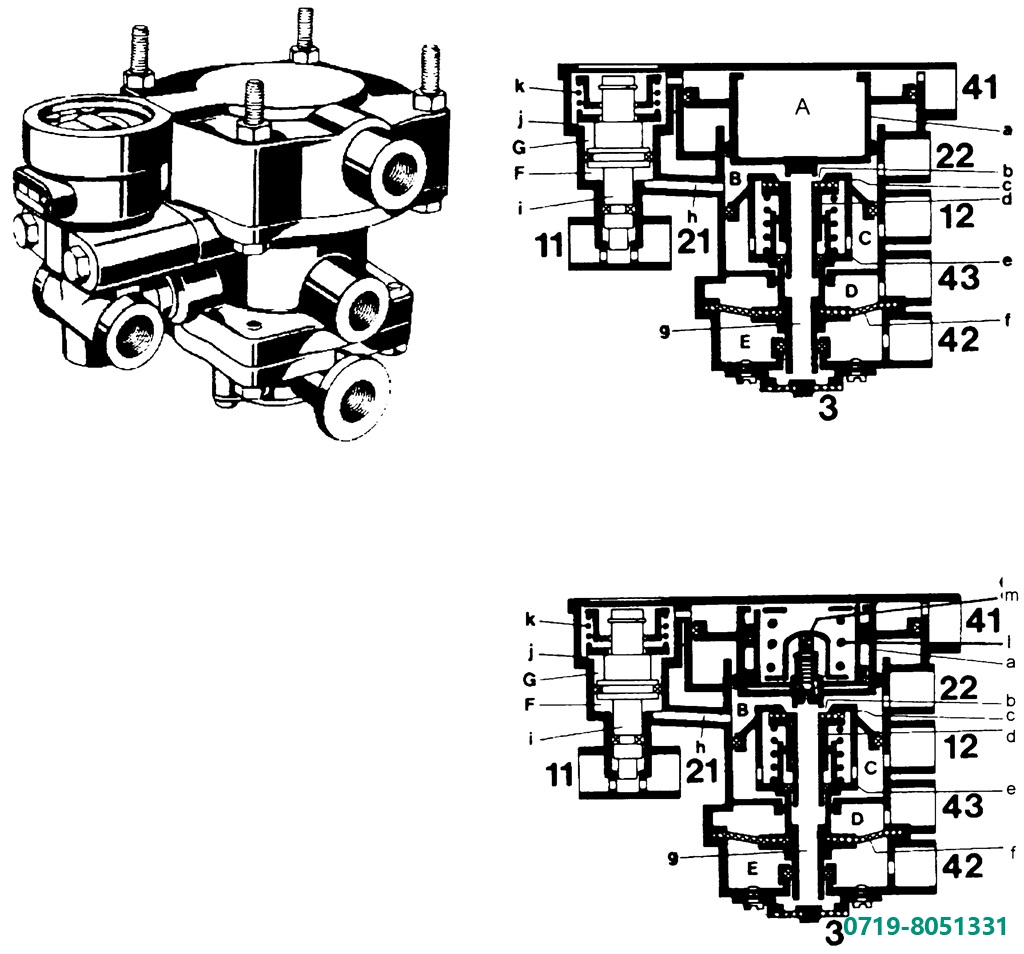 气压从1口进入同时到达ABCD四腔。当达到阀门的开启压力时阀门2356同时被打开,压缩空气经21,22,23,24口输送到贮气筒。当某一回路例如21失效时,由阀门3,5,6的单向作用,保证22,23,24回路的气压不卸漏,同时22,23,24口的气压作用在膜片上4上和膜片1的右半部分,使得1口的气压容易将阀门3,5,6打开继续向22,23,24回路供气。当充气压力达到或超过阀门2的开启压力时,气压才从损坏的回路21中泄漏,而尚未失效的其它回路的压力仍能得到保证。